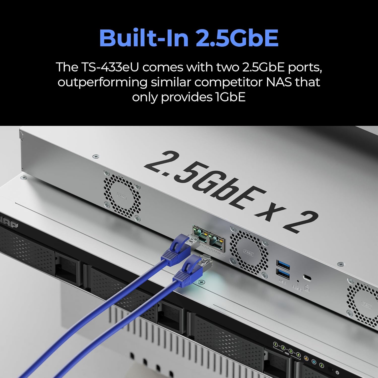 • Dual 2.5GbE (2.5G/1G/100M) ports accelerates file sharing across teams and devices or streamline large file transfers