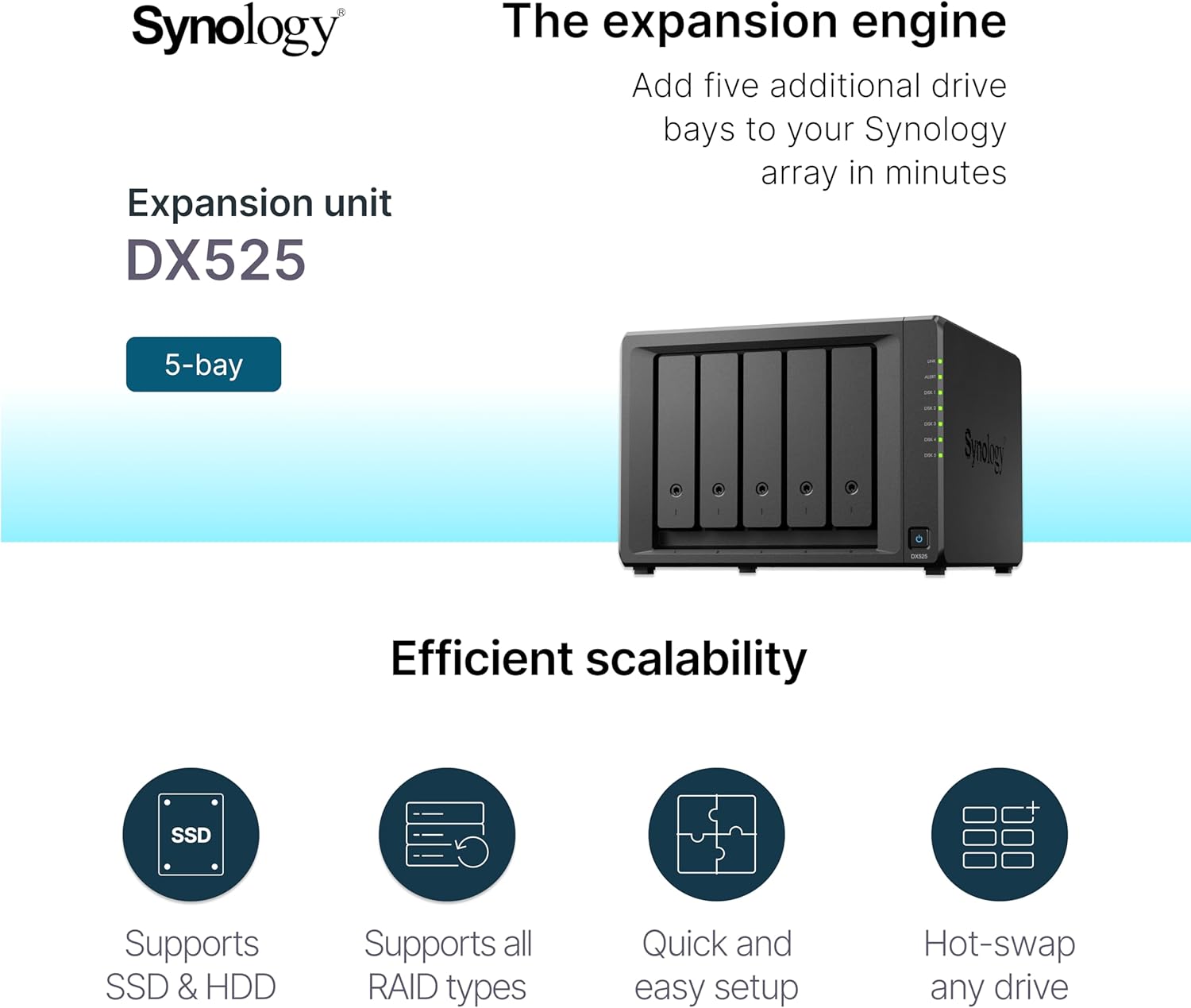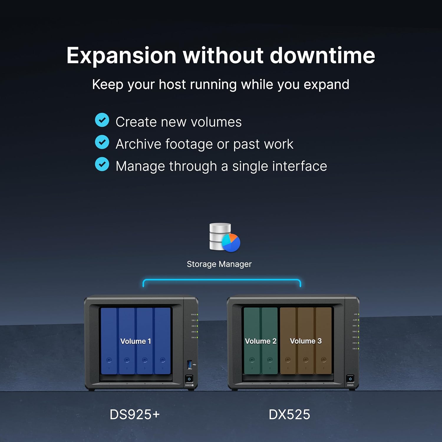 The Synology DX525 provides a dedicated local backup solution for your Synology DiskStation. When configured as a separate volume, it safeguards data on its local disks in case of system failure.
